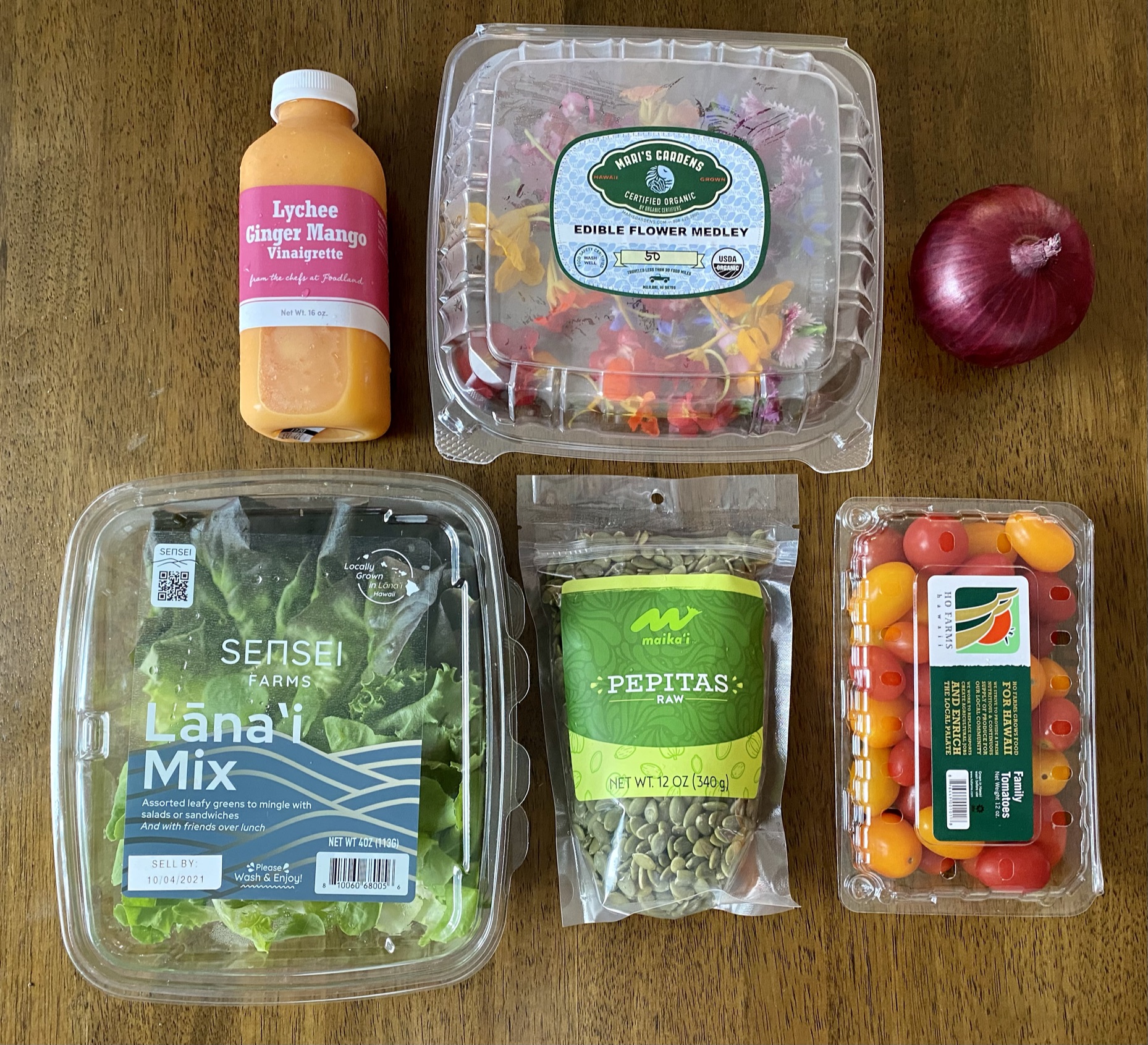 I needed to start with a base of greens. Initially, I thought I would use arugula, but couldn’t resist the beautiful Lāna’i Mix from Sensei Farms. I picked it up at Foodland Kahala MKT., along with the other ingredients listed below (of course with the exception of the flowers).